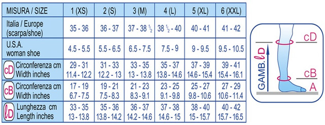 Компресія та показання: трикотаж з градуйованою середньою компресією, рекомендований для лікування венозної недостатності, також хронічної, з можливим поширенням варикозних вен та формуванням набряків. Вишуканий та прозорий трикотаж, легко прикриваючи, приховує незначні недоліки шкіри.